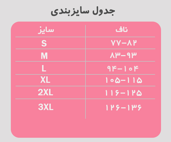 جدول سایزبندی: برای راحتی شما، ما یک جدول سایزبندی دقیق ارائه میدهیم تا بتوانید با اندازه دور شکم خود، بهترین سایز را انتخاب کنید. این جدول شامل دامنههای اندازهگیری از سایز اسمال تا سه ایکس لارج است.