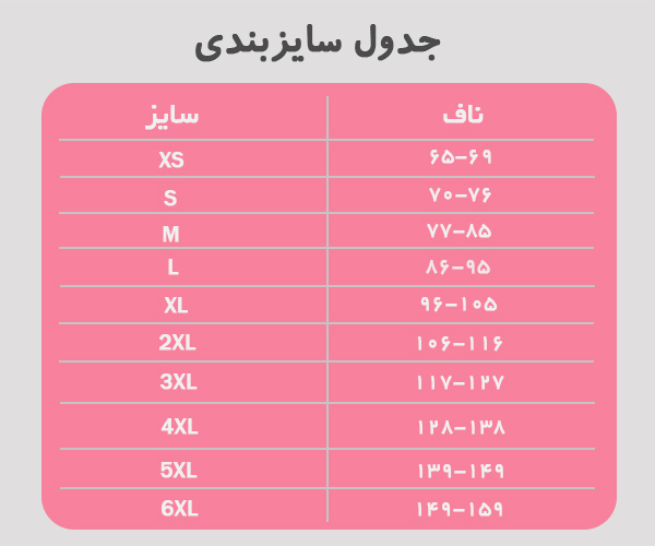 نحوه انتخاب سایز بندی: با متر دور شکم را اندازه بگیرید و با توجه به جدول زیر انتخاب فرمایید