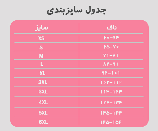 نحوه انتخاب سایز بندی: با متر دور شکم را اندازه بگیرید و با توجه به جدول زیر انتخاب فرمایید