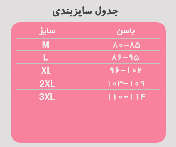 دور باسن از 80 تا85: سایز M دورباسن از 86تا 95: سایز L دور باسن از 96 تا 102: سایز XL دور باسن از 103 تا 109: سایز 2XL دور باسن از 110 تا 114: سایز 3XL